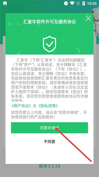 1、阅读《汇查车软件许可及服务协议》相关条款后,点击弹窗中的【同意并继续】按钮,进入软件的登录选择界面。