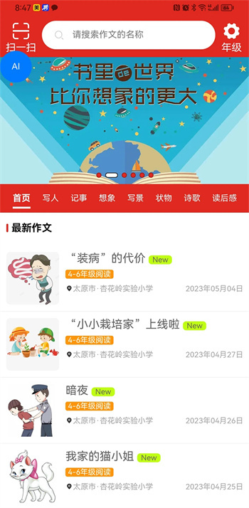 新作文是一款专为小学生设计的手机写作辅助软件。它收录了海量不同主题的小学生作文素材,孩子们可以通过阅读这些优质范文,学习实用的写作技巧,积累精彩的好词好句,从而有效提升自己的写作水平。