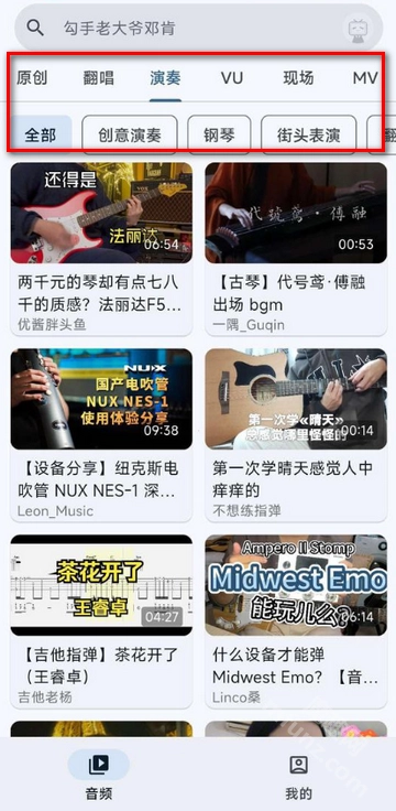 4、类型丰富,包括原创、翻唱、演奏、vu、现场和mv等。