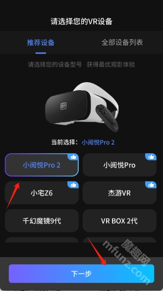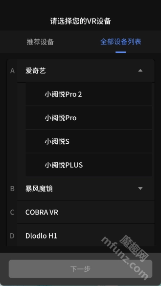 1.打开爱奇艺vr后,选择你的vr设备,然后点击下一步