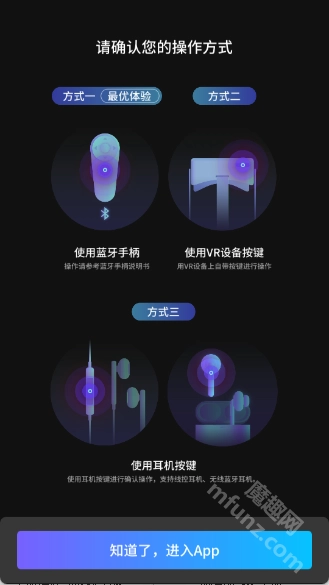 2.然后确认你的操作方式,共支持3种,分别是使用蓝牙手柄、使用vr设备按键、使用耳机按键