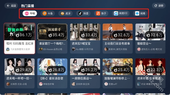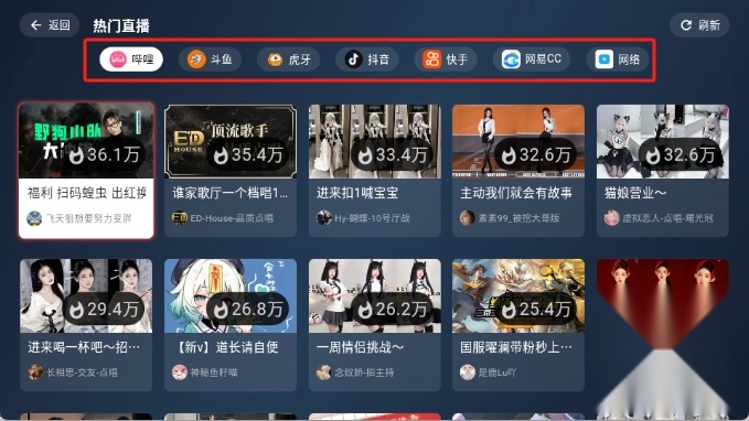 1.点击热门直播,可以看到抖音、斗鱼、快手、虎牙、b站等直播平台直播内容,想看哪个平台就点哪个