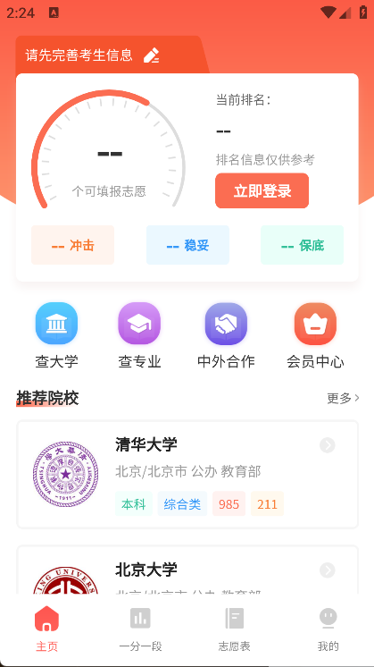 1. 模拟志愿填报:考生输入高考分数后,系统将生成“冲、稳、保”梯度的志愿推荐,并提供精准的录取概率分析。