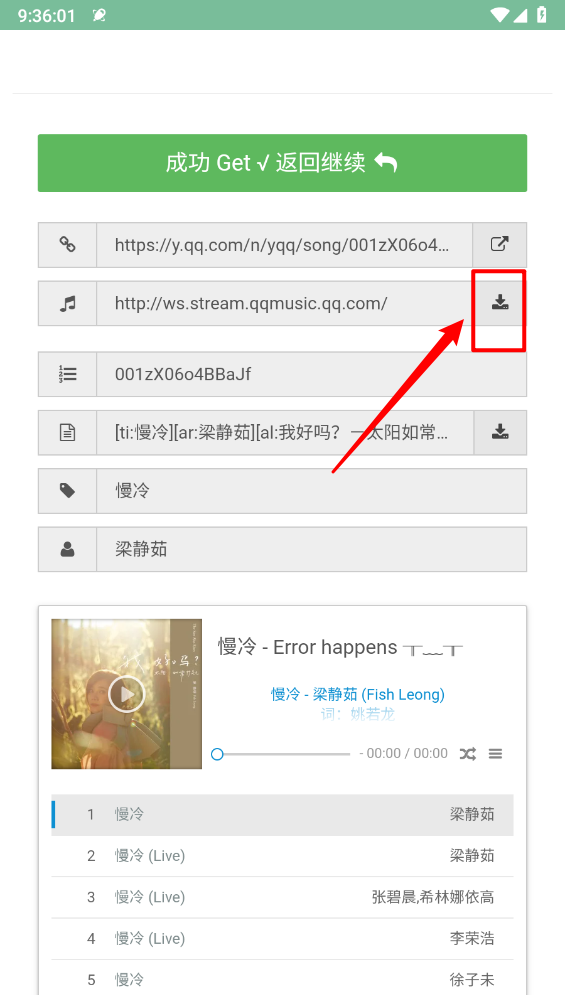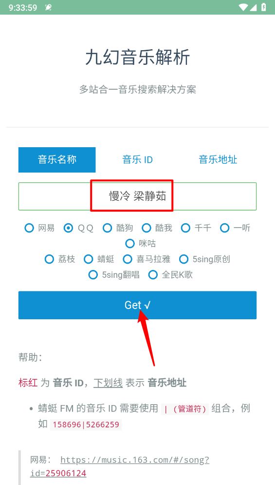 2、支持通过音乐名称、音乐ID或音乐地址搜索并解析心仪的歌曲,操作示例:输入歌曲相关信息,选择对应平台后点击“Get”按钮即可。