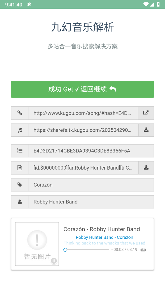 九幻音乐解析是一个主打多平台整合的音乐搜索与解析工具,所有功能均免费开放,用户可以在这里畅听来自网易云音乐、酷狗音乐、一听音乐、酷我音乐等多个平台的歌曲。此外,它还支持通过输入音乐ID直接查找目标曲目,无需在不同音乐应用间频繁切换,就能一站式满足你的听歌需求。