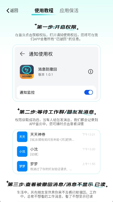 消息防撤回是一款非常实用且好用的手机信息防撤回软件,可以帮助我们查看在聊天过程中被对方撤回的消息。并且不论是文字、图片还是语音,消息防撤回都可以进行还原,避免自己错过了重要信息。而且消息防撤回平台还会统计撤回消息的数量,以便我们进行统一的管理。此外,各种垃圾消息都会被拦截下来,让手机更加清爽!