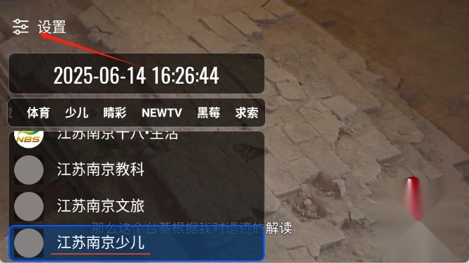 1.打开ourtv后,点击屏幕任意位置。在弹出的界面中,点击设置
