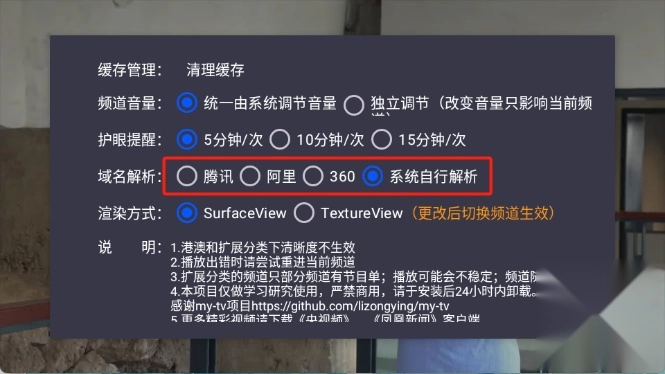 ourtv没有直接自定义直播源入口,不过可以切换域名解析。目前支持腾讯、阿里、360以及系统自行解析这4种方式。