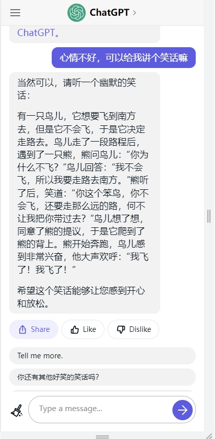 2、玩法比较的自由,不同类型,各种问题都能回复,难不倒的AI,让人震撼;