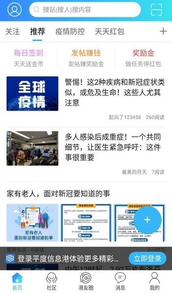 1.安装并打开平度信息港后进入【首页】,点击屏幕右下方的蓝色按钮,然后选择【发帖有奖】选项。