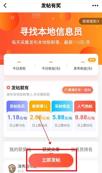 2.进入【发帖有奖】页面后,点击页面底部的【立即发帖】按钮,就能开始编辑内容并发布了。
