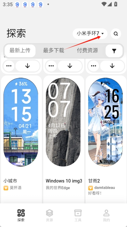 米坛表盘自定义工具可以根据自己手环型号来自由切换,里面有很多表盘资源,大家可以根据最新上传或最多来筛选,同时你也可以自己上传表盘或小程序,另外还可以在手机上面通过米坛表盘自定义工具来制作专属表盘,工具里面支持查看和删除已安装小程序。