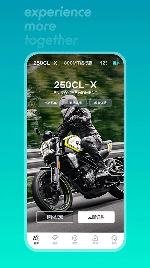 春风摩托是CFMOTO全系列车型手机智能车载软件,春风摩托与摩托车绑定互联后,即可直接在手机上调自动档、进行车辆体检、闪灯鸣笛、ota升级等操作,如果有喜欢的摩托车,还可以在春风摩托上进行订购或者预约试架,如果你对其他平台的周边商城不放心,可以在春风摩托商城版块买你想要的保养、装备等商品。