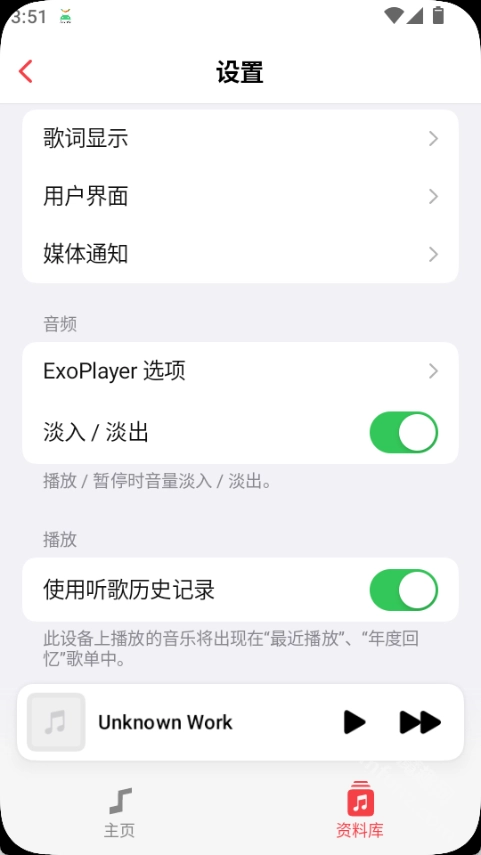 4.设置界面可以进行歌词显示、使用听歌历史记录、用户界面等设置
