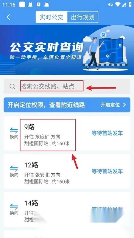 2、在顶部搜索框输入想查询的线路名称或站点名称,下方将自动显示匹配结果;