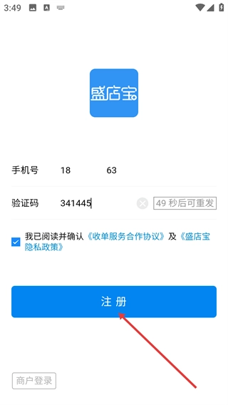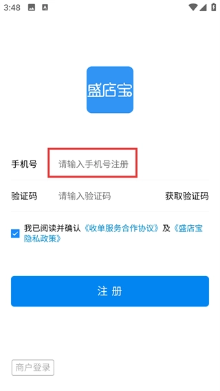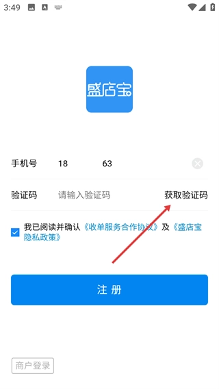 2、在【盛店宝】注册页,先在【请输入手机号注册】框填写号码,勾选协议后准备获取验证码。