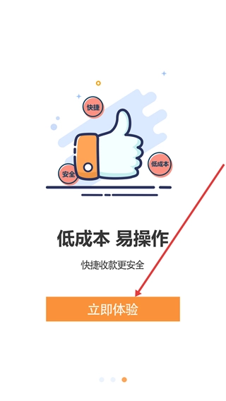 1、在展示【低成本-易操作】功能的引导页,点击【立即体验】按钮,进入【盛店宝】的注册流程界面。