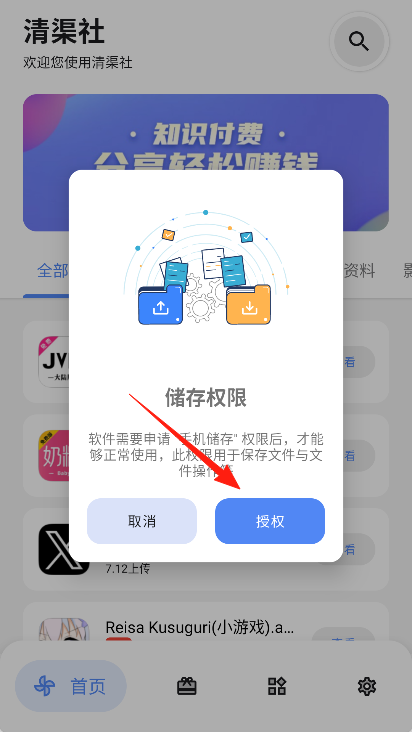 2、进入清渠社主界面后,需授予该软件必要的权限。