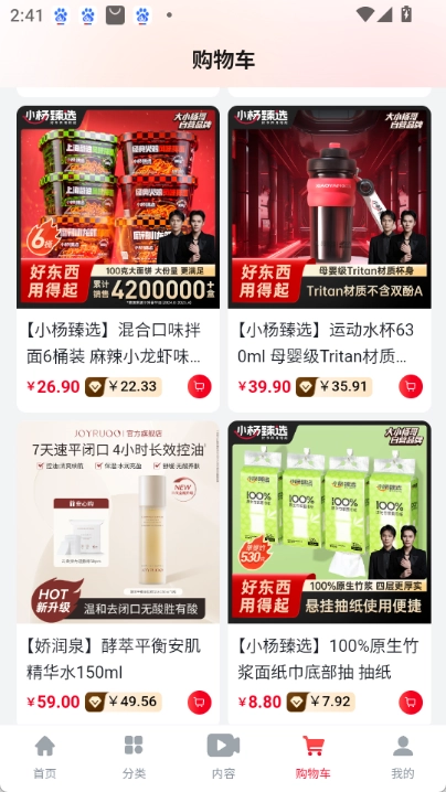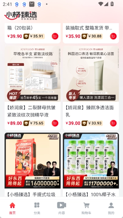 小杨臻选团购平台即小杨臻选,是三只羊的自营商城,小杨臻选后新人都可以享受新人专享价,还可以在小杨臻选上看大小杨哥直播,还能领取臻宝积分,可以用来抵扣购物,目前小杨臻选团购平台共分为首页、分类、内容、购物车以及我的几大板块,大家团购商品可以进到分类里,根据分类来挑选,或者直接搜索商品来购买。