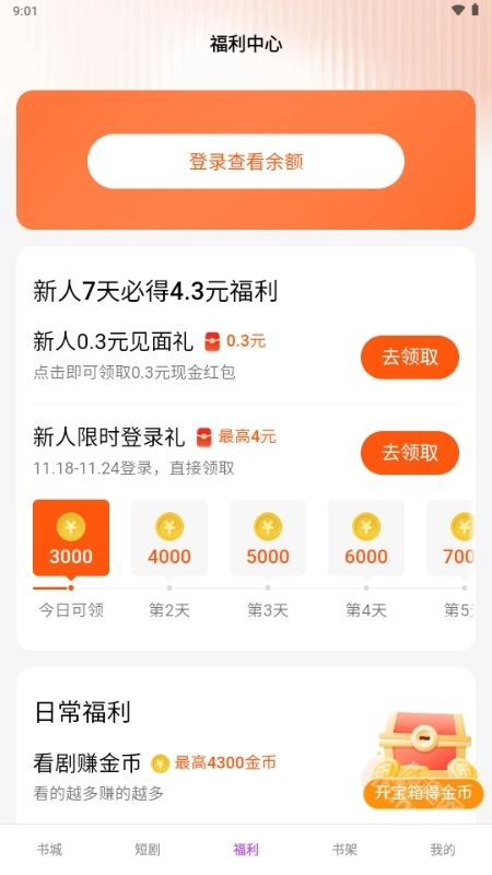 短剧互动奖励:在短剧板块中,观看5个左右广告可获得5000金币(约0.5元),首次满0.3元即可提现,且平台提供7天小额提现机会,每天可提0.3元。