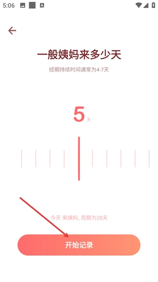 4、在经期持续天数设置页,选择对应天数(如5天),点击【开始记录】,完成配置并进入应用主功能界面。