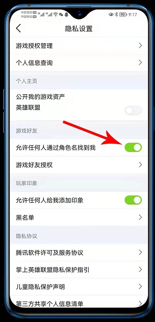 4.在隐私设置游戏好友分项中,找到“允许任何人通过角色名找到我”选项,关闭后面的开关(默认是打开的),这样陌生人就无法通过搜索角色名称查看战绩,需要注意的是此时自己也无法通过搜索查看其他人战绩;