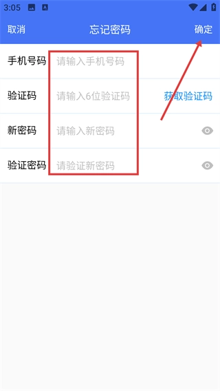 2、在【忘记密码】页面,依次输入【手机号码】-获取并填写【验证码】-设置【新密码】及【验证密码】。