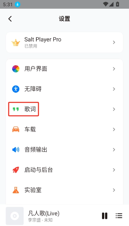 3.在设置菜单中,找到并点击“歌词”选项。