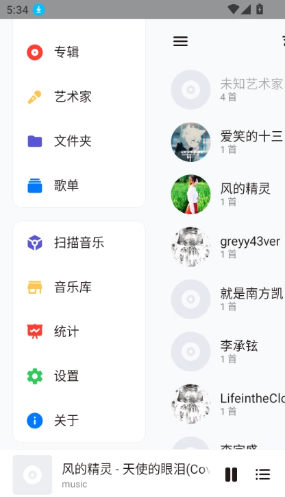 2.在 Salt Player的主界面,可以看到所有扫描到的音乐文件。可以通过艺术家、专辑、流派等方式浏览音乐,也可以直接搜索特定的歌曲。