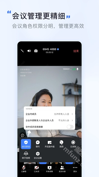 觅讯安卓手机版不限时长、不限场次,单场视频会议最高支持2000人同时在线,不管是小型公司还是大型企业都能满足大家的需求。它还支持自定义设置会议角色权限,提高会议安全性,比如设置允许企业内所有成员限制就在会有企业内部员工才能进入会议室,外部人员无法进入,保证了会议内容的安全!