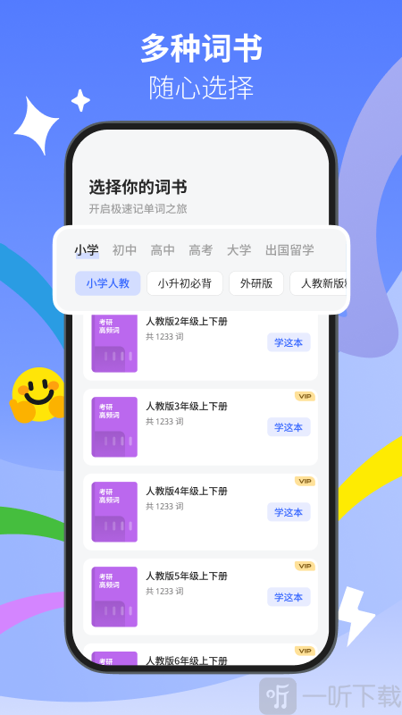 2. 丰富的单词库涵盖了小学、初高中、大学、考研、出国留学等不同学习阶段所需的词汇。