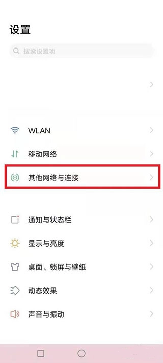 1、下拉手机屏幕,打开「设置」界面,选择「其他网络与连接」。