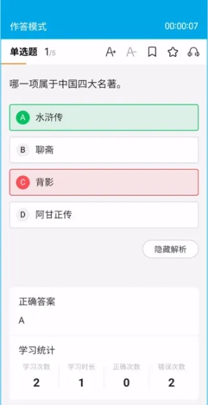 1、答对自动进入下一题,答错则显示正确答案和解析。