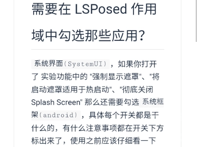 想要将启动遮罩进化关闭的话,需要在LSPosed作用域中勾选“彻底关闭Splash Screen" 那么还需要勾选 系统框架(android),具体每个开关都是干什么的,有什么注意事项都在开关下方标出来了,使用之前应该仔细看一下。