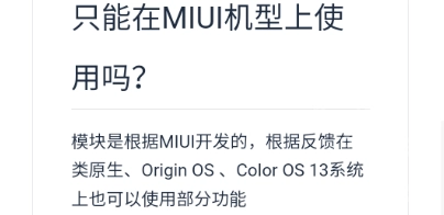 启动遮罩进化模块是根据MIUI开发的,根据反馈在类原生、0rigin 0s、Color 0s 13系统上也可以使用部分功能。