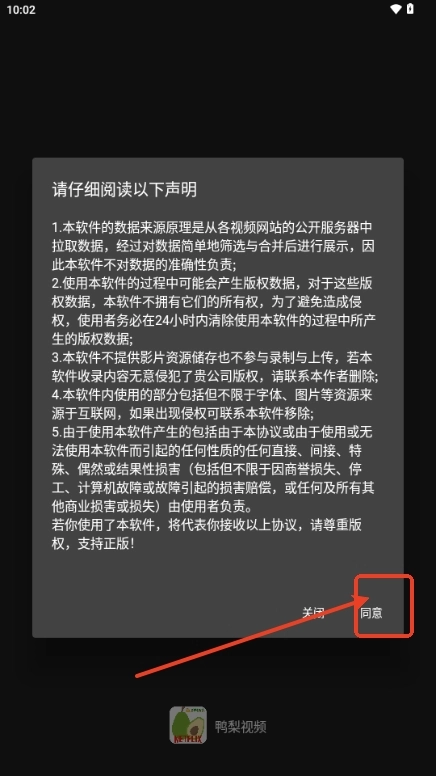 1. 打开软件同意鸭梨视频软件的使用政策。