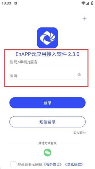 2、进入【En云应用接入软件2.3.0】登录页,可在【账号/手机/邮箱】框填信息,输密码后点【登录】,也可选【短信登录】。