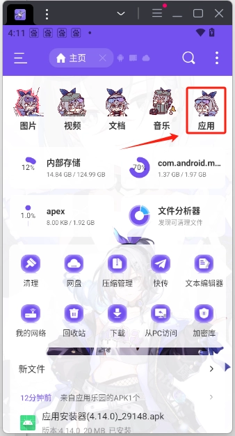 1.想要将OPPO应用安装器设置成默认安装软件,那么我们需要打开一些权限,可以利用es管理器,选择应用,然后打开OPPO应用安装器
