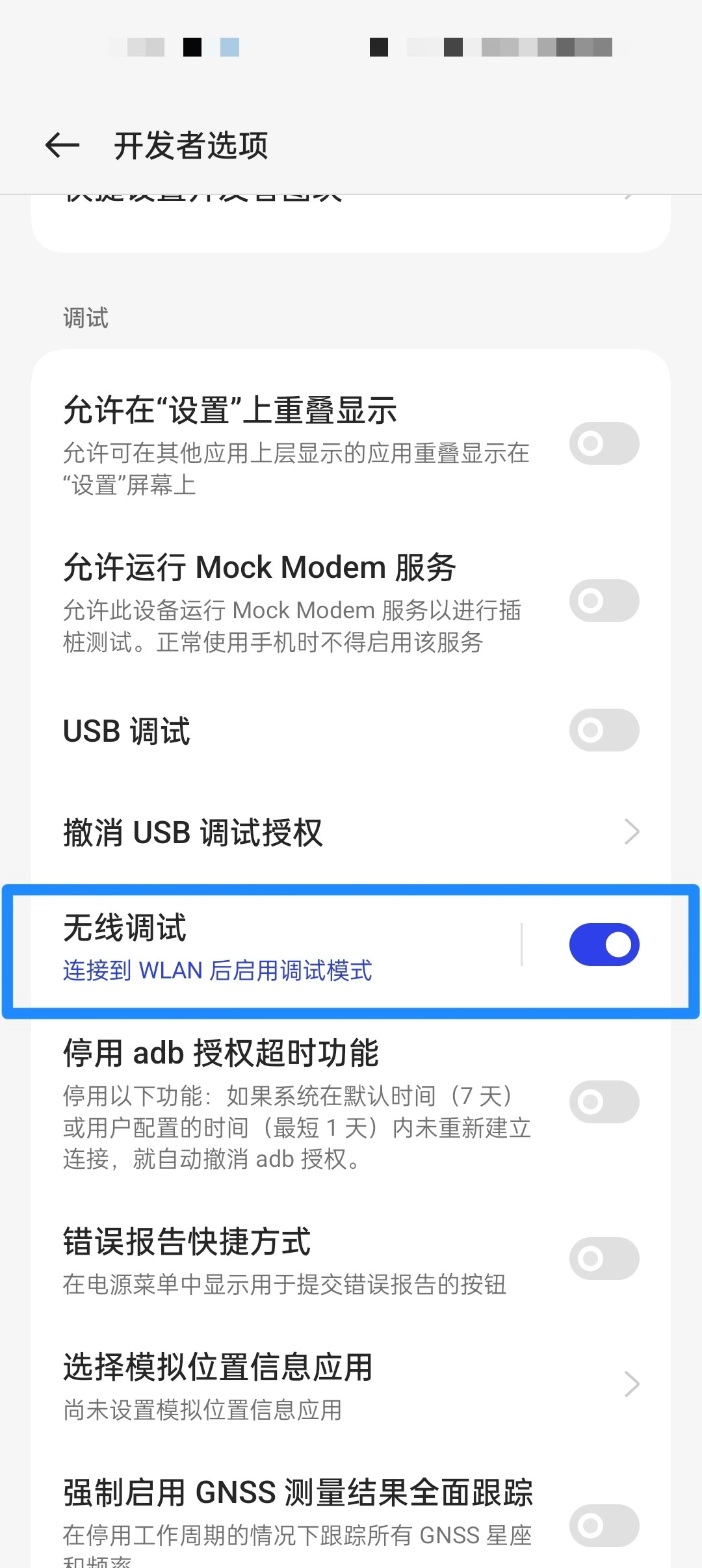 3、在【开发者选项界面】打开无线调试。