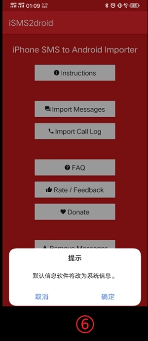 4、无论是导入完成后关闭弹窗,还是因报错关闭弹窗,系统都会提示将默认短信应用改回手机自带的。