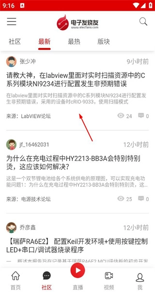 1、打开软件后,进入社区最新板块,展示多条技术相关帖子,浏览LabVIEW配置问题帖的内容信息。