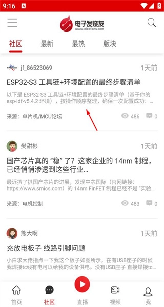 3、回到社区主板块,展示各类技术帖子,箭头指向ESP32配置帖,可点击浏览该帖子的内容。