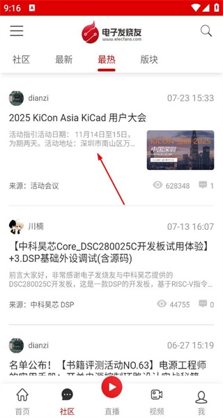 2、切换至社区最热板块,展示活动及技术内容,浏览KiCon Asia活动帖的详情信息。