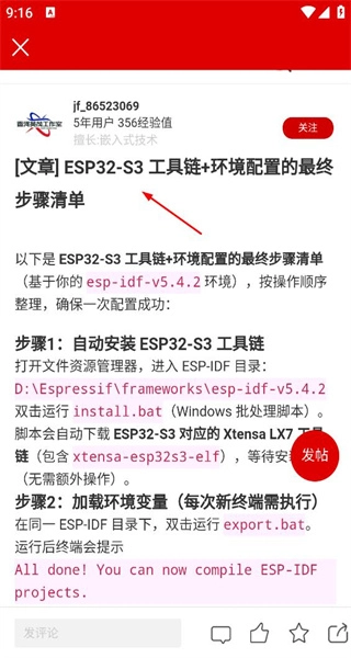 4、进入ESP32配置帖详情页后,文章展示工具链配置步骤,用户可浏览该详情页的具体信息。