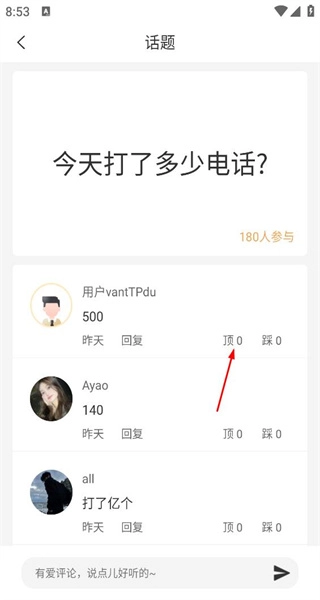4、再选择今天打了多少电话话题,进入详情页查看用户分享的当日通话数量回复。