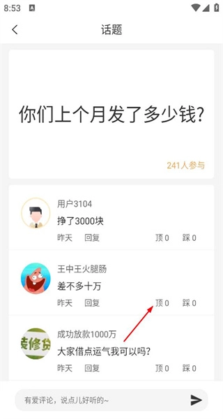3、返回话题列表选择你们上个月发了多少钱话题,进入详情页查看用户的收入相关回复。