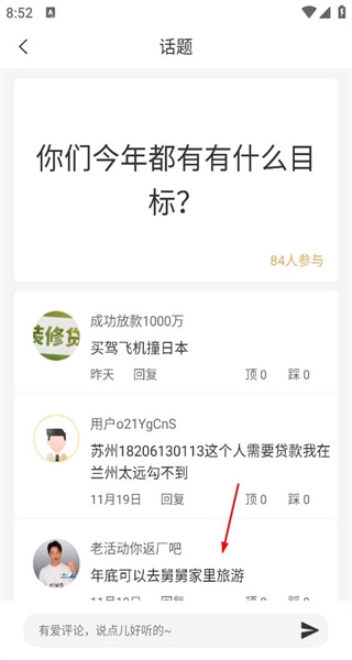 2、进入该话题详情页,看到多位用户分享的今年目标内容,浏览这些不同的回复信息。