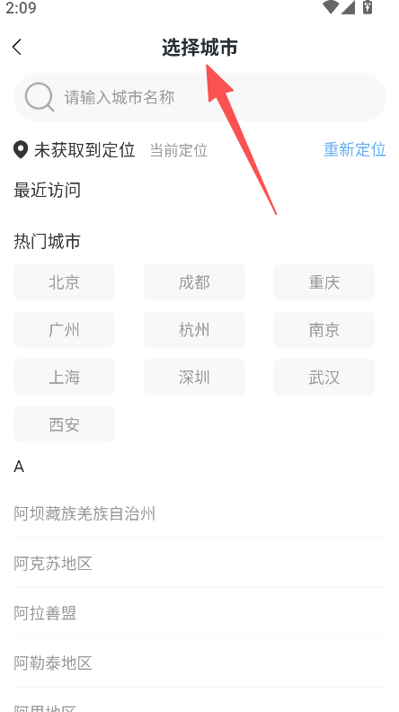 3、进入选择城市页面选择目标城市。