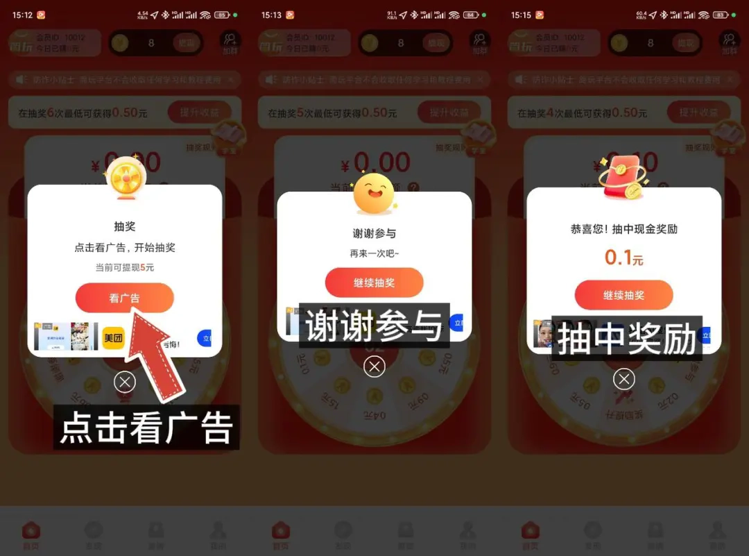 第二种是谢谢参与,那就需要去看提升收益的广告,提高中奖几率
