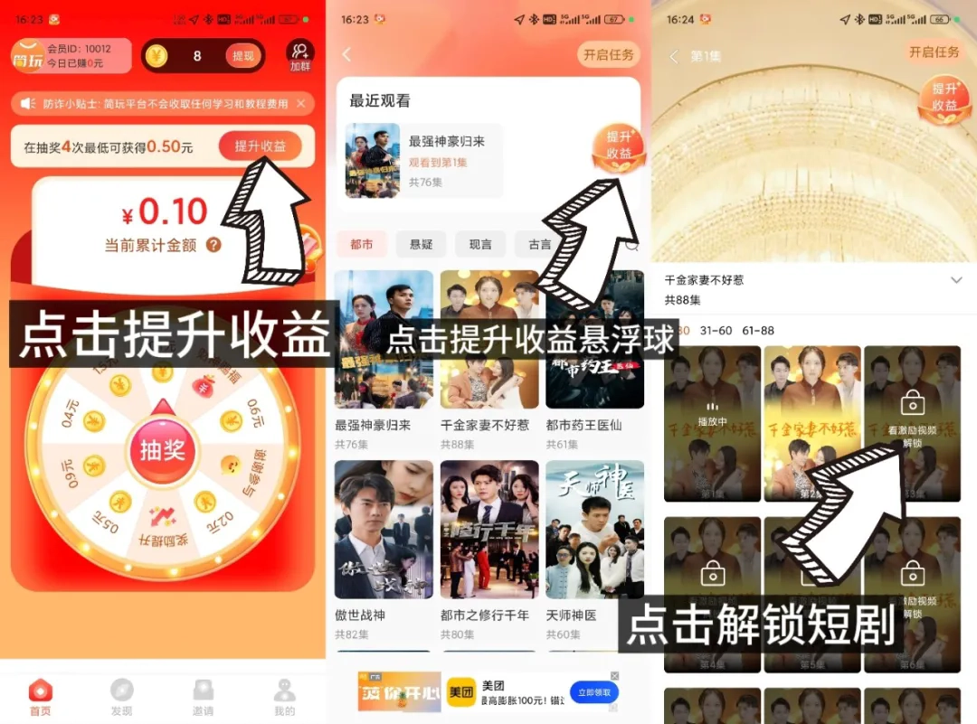进入首页,即可点击提升收益进入短剧/短视频页面